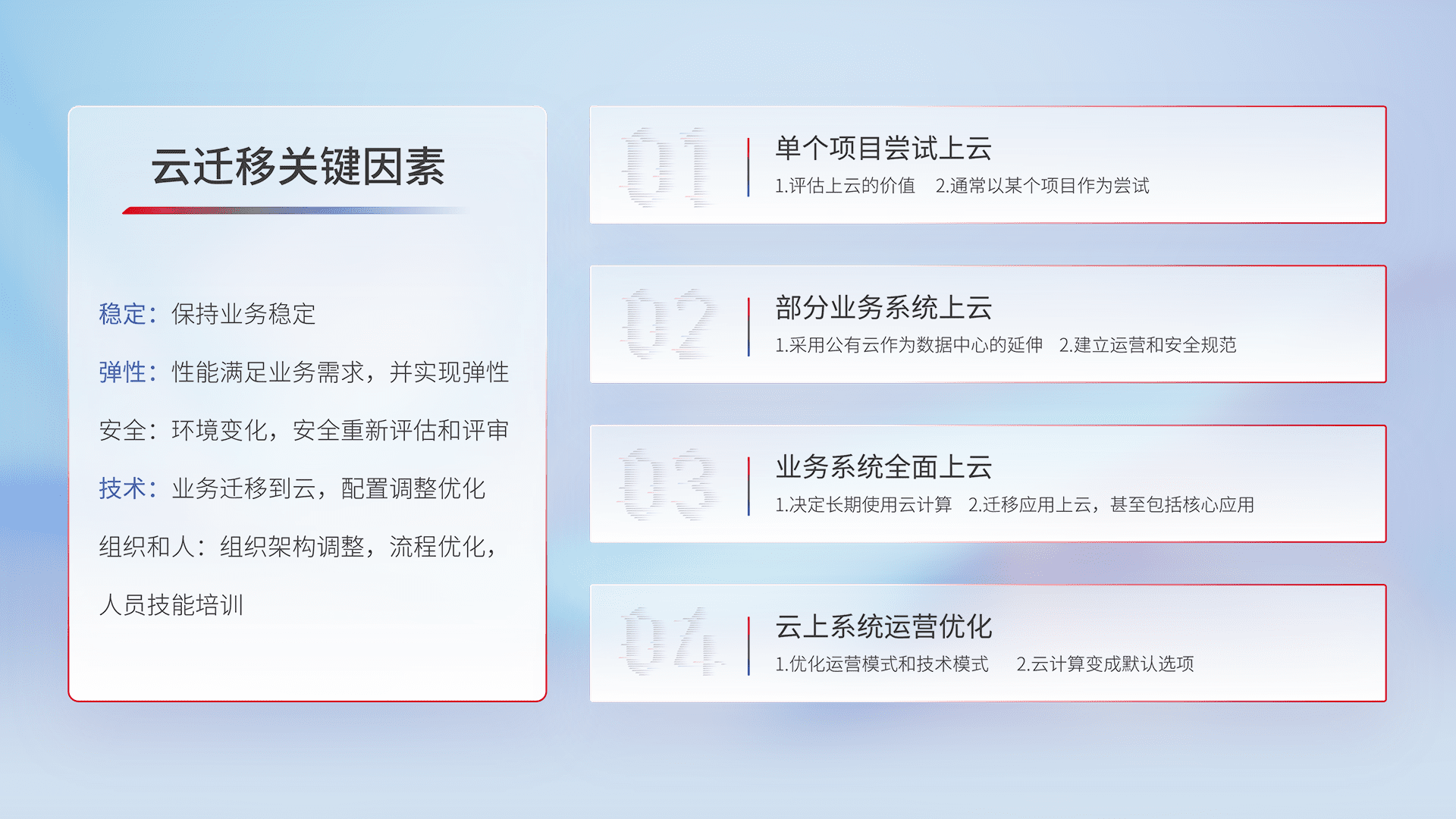 结合实际业务,,,从规划设计、、云平台选型、、、云原生改造、、、数据迁移、、集成交付,,迁移全过程为客户识别最佳上云路径,,,,做好风险识别管理,,,,设计网络架构、、、身份权限、、、、安全审计合规、、、、操作审计、、、日志审计、、、、监控告警策略、、多站点容灾设计等,,,,对云上基础设施进行整体规划,,,,提升IT治理水平,,,以满足弹性、、高可用、、、高性能的需求。。。